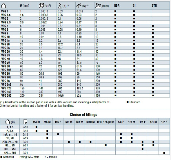 詳細(xì)信息 VPG1,VPG1.5,VPG2,VPG3.5,VPG5,VPG6,VPG8,VPG10,VPG15,VPG20,VPG25,VPG30,COVAL超平吸盤(pán) VPG系列超平吸盤(pán),Ø1 - 200mm,材料:丁腈橡膠(NBR),硅膠(SI),Siton®(STN)。 主要參數(shù)見(jiàn)下表: