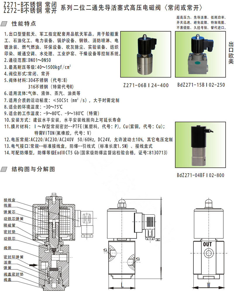 Z271-01B,Z271-02B,Z271-03B,Z271-04B,Z271-15BF,Z271-20BF,不銹鋼先導(dǎo)活塞式高壓電磁閥