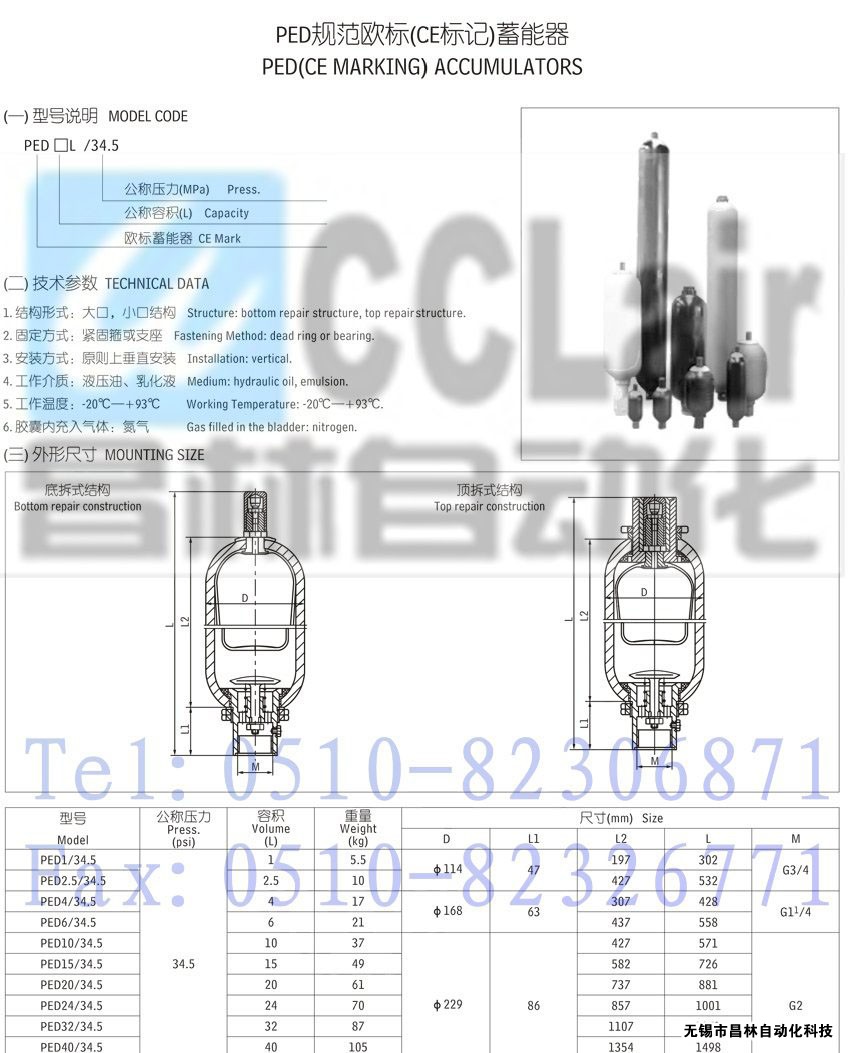 詳細信息 PED1/34.5,PED2.5/34.5,PED4/34.5,PED6/34.5,PED10/34.5,PED15/34.5,規(guī)范歐標(CE標記)蓄能器,生產廠家,價格