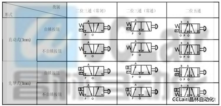 按鈕式人控閥分直動式和先導(dǎo)式兩種,主要用作控制氣路的開關(guān)和改變控制氣路的方向,可發(fā)出氣信號給氣控換向閥使其