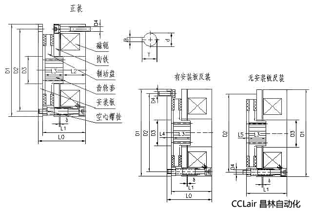 DZS2及DZS3的基本模塊,分為正裝、反裝(有安裝板及無安裝板),制動器勵磁線圈的額定直流電壓為:DZS-30及以下=DC99V,DZS-40及以上=DC171V,并可根據(jù)用戶要求設(shè)計(jì)特殊電壓。