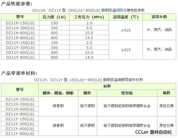 DZ11H、DZ11Y 型 150(Lb)~800(Lb) 鍛鋼低溫閘閥:手動(dòng)、內(nèi)螺紋(絲口)連接、明桿楔式單閘板,DZ11H 閥座密封面材料為 Gr3 系不銹鋼、DZ11Y 閥座密封面材料為硬質(zhì)合金,壓力等級 150Lb~800Lb,閥體為碳素鋼的低溫型閘閥。