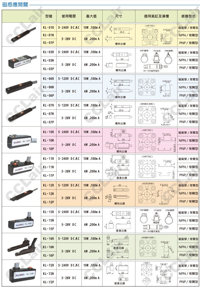 KL-01,KL-03,KL-06,KL-07,KL-10,KL-11,KL-12,KL-15,KL-16,KL-72,國鷹KUOIN磁感應開關 |