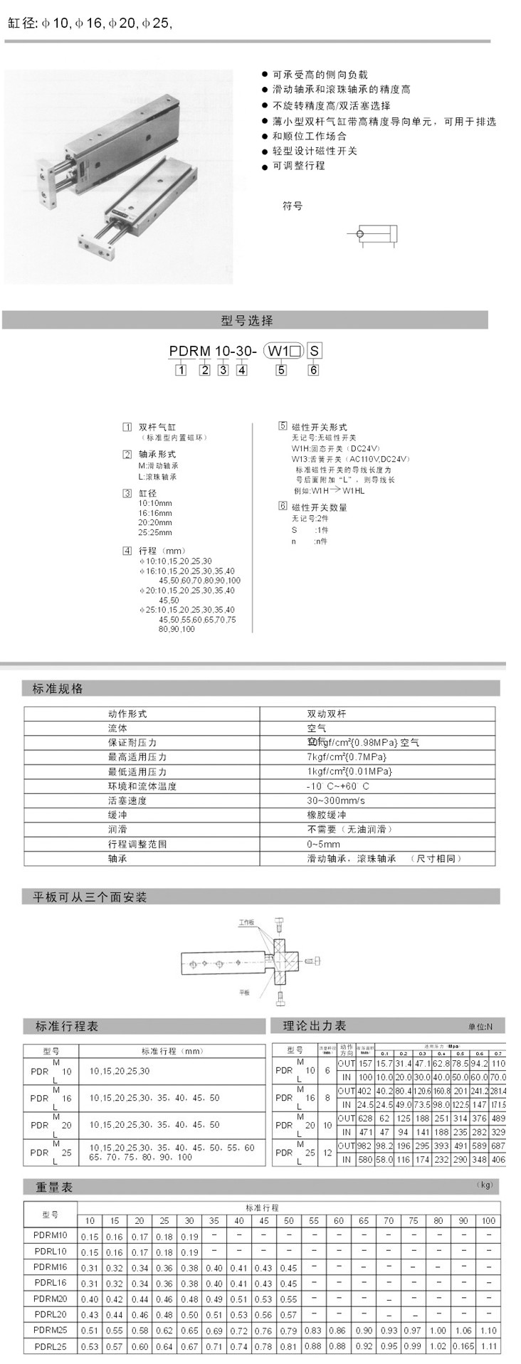 PDRM10-10,PDRM10-15,PDRM10-20,PDRM10-25,PDRM10-30,PDRM16-10,雙桿氣缸PDR系列