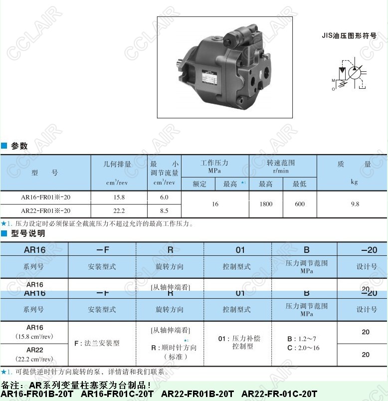 AR16-FR01B-20T,AR16-FR01C-20T,AR22-FR01B-20T,AR22-FR01C-20T,AR,變量柱塞泵YUKEN