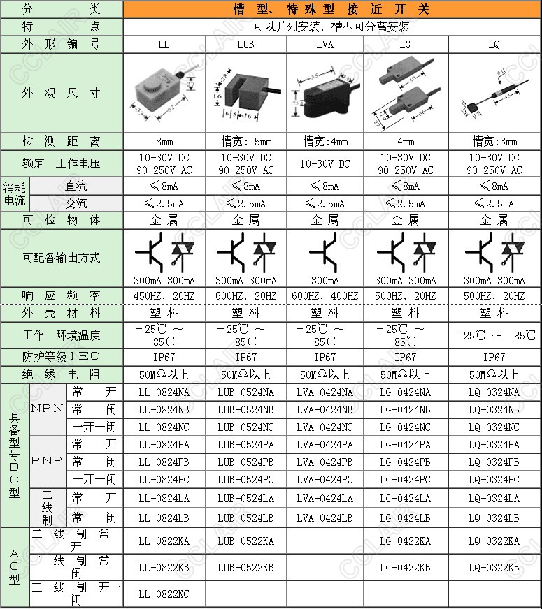 LL-0824NA,LUB-0524NA,LVA-0424NA,LG-0424NA,LQ-0324NA,LL-0824NB,LUB-0524NB,LVA-0424NB,槽型、特殊型接近開關(guān)