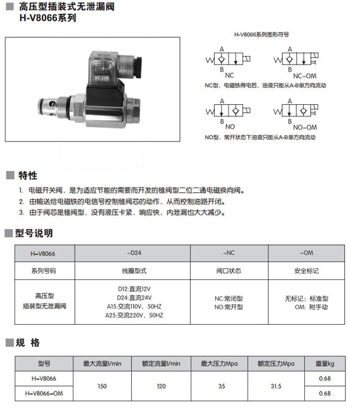 H-V8066-D12,H-V8066-D24,H-V8066-A15,H-V8066-A25,H-V8066-D12-NO-OM,H-V8066-A25-NC,高壓型插裝式無(wú)泄漏閥