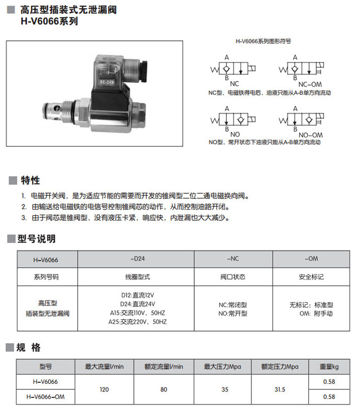 H-V6066-D12,H-V6066-D24,H-V6066-A15,H-V6066-A25,H-V6066-D12-NO-OM,H-V6066-A25-NC,高壓型插裝式無(wú)泄漏閥