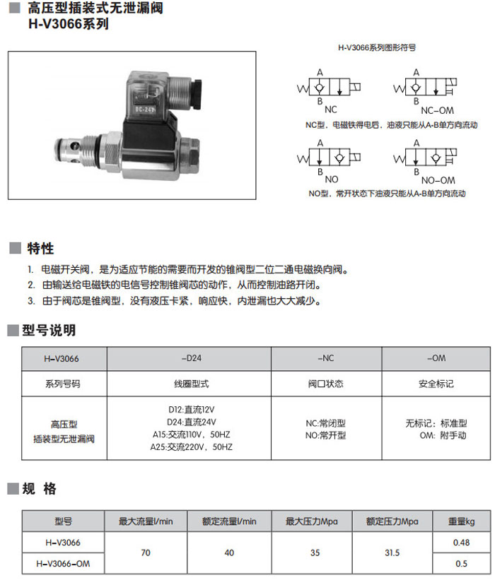 H-V3066-D12,H-V3066-D24,H-V3066-A15,H-V3066-A25,H-V3066-D12-NO-OM,H-V3066-A25-NC,高壓型插裝式無(wú)泄漏閥
