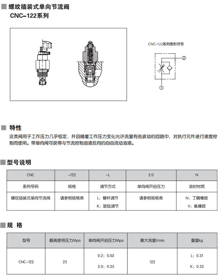 CNC-122-L2.0N,CNC-122-L0.2N,CNC-122-K2.0N,CNC-122-K0.2V,CNC-122-L2.0V,螺紋插裝式單向節(jié)流閥