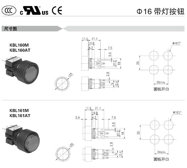 KBL16M,KBL16AT,KBL16SM,KBL16SAT,KBL16RM,KBL16RAT,KBL160M,KBL160AT,KBL161M,KBL161AT,Koino Φ16帶燈按鈕