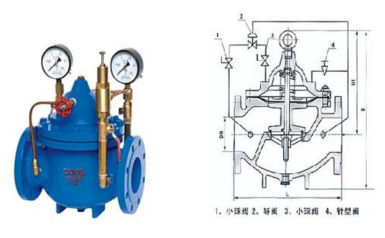 當(dāng)主閥出口壓力低于導(dǎo)閥設(shè)定的壓力時(shí),導(dǎo)閥此時(shí)處于開通狀態(tài),主閥上腔壓力與主閥出口壓力相等,進(jìn)口與吃口存在壓差,水流經(jīng)閥口出口流出,當(dāng)消防泵氣泵時(shí),或變平泵壓力升高時(shí),超過導(dǎo)閥設(shè)定壓力,由主閥進(jìn)口向?qū)чy管控制室壓力升高,作用在彈簧壓力增大,向下壓緊,帶動閥芯下移,使導(dǎo)閥關(guān)閉,此時(shí)主閥進(jìn)口壓力通過節(jié)流閥補(bǔ)充到主閥閥蓋上腔,因閥瓣受到向下壓力大于向上推力,主閥關(guān)閉