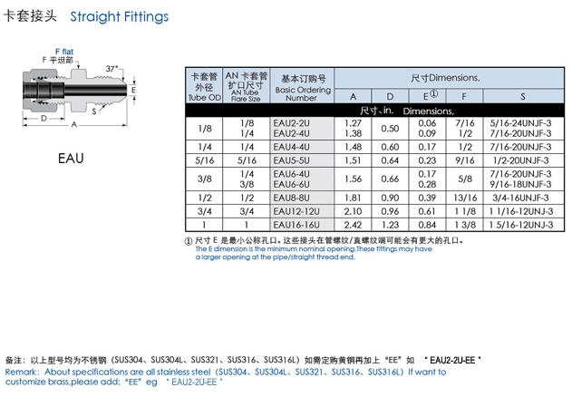 EAU2-2U,EAU2-4U,EAU4-4U,EAU5-5U,EAU6-4U,EAU6-6U,EAU8-8U,直通擴口卡套接頭