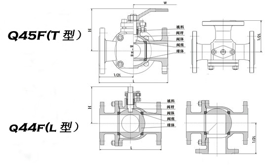 Q45F三通四密封球閥可分為L形和T形,L形(Q44F)三通球閥用于介質(zhì)流向的切換,能使相互垂直的兩個通道連接;T形(Q45F)三通球閥用于介質(zhì)分流、合流及流向切換。T形三通可以使三個通道相互連通或使其中的兩個通道連通。三通球閥一般采用兩閥座結(jié)構(gòu),亦可根據(jù)用戶要求采用四閥座結(jié)構(gòu)。