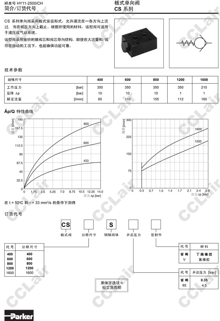 CS400S,CS600S,CS800S,CS1200S,CS1600S,CS400SV,CS400S65,CS400S65V,Parker板式單向閥