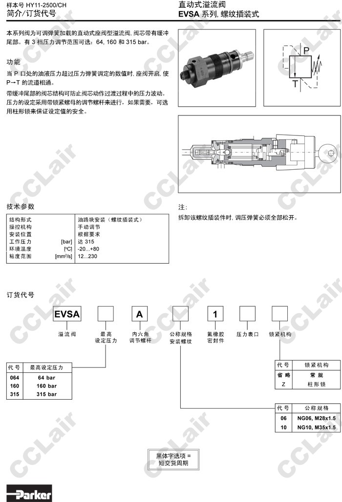 詳細信息 EVSA064A061,EVSA064A101,EVSA160A061,EVSA160A101,EVSA315A061,EVSA315A101,Parker直動式溢流閥