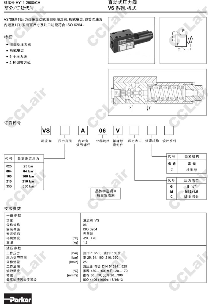 詳細信息 VS025A06VG,VS064A06VG,VS160A06VG,VS210A06VG,VS350A06VG,VS025A06VM,Parker直動式壓力閥