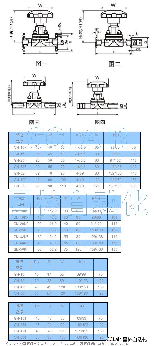 GM型系列高真空隔膜閥是利用閥桿將橡膠膜直接壓在閥座上,用來截止或接通真空系統(tǒng)。采用連接形式有活套法蘭連接、快卸法蘭連接、焊接式連接。焊接式連接又分焊接式I型連接(即兩端焊接),焊接式II型連接(即一端焊接,另一端插入)。