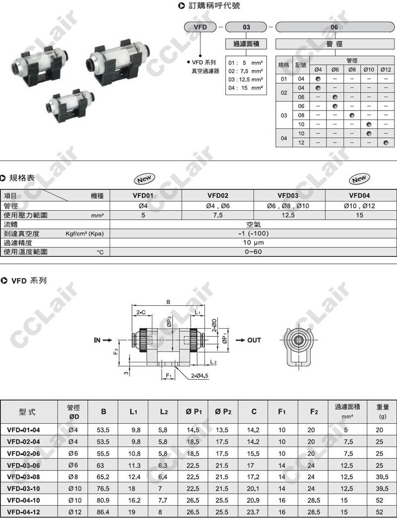 詳細(xì)信息 氣立可(chelic),VFD-01-04,VFD-02-04,VFD-02-06,VFD-02-06,VFD-03-08,VFD-03-10,VFD-04-10,VFD-04-12,真空過(guò)濾器