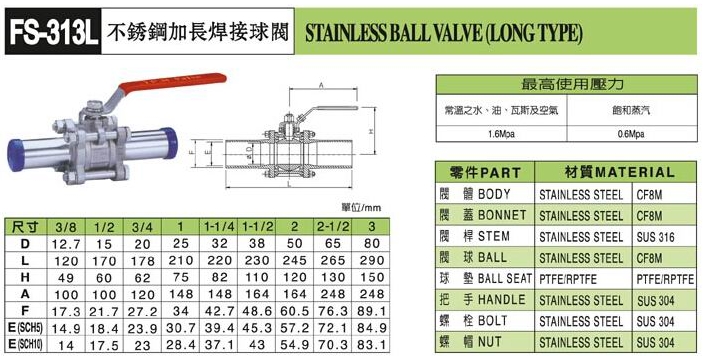 FS-313L不銹鋼加長焊接球閥在各個領(lǐng)域使用都非常廣泛,其優(yōu)越的品質(zhì)和高性能的穩(wěn)定性是普通鑄鋼球閥所無法達(dá)到的,加長焊接球閥使用壽命遠(yuǎn)遠(yuǎn)大于鑄鋼球閥,富山焊接球閥廣泛應(yīng)用于城市燃?xì)?、城市?熱、石油化工、造船、鋼鐵、調(diào)壓站、發(fā)電廠等各類管道設(shè)備上。