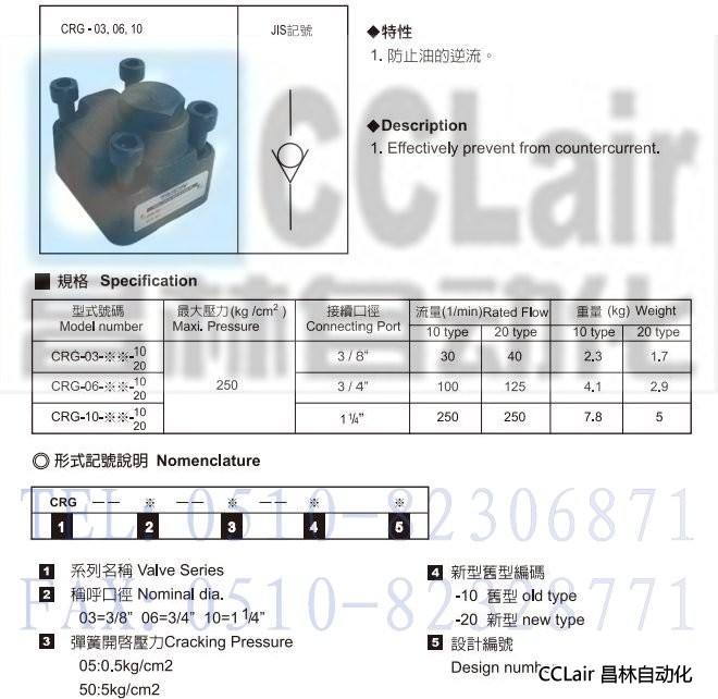 CRG-03-05-10,CRG-03-50-10,CRG-03-05-20,CRG-03-50-20,止逆閥