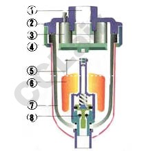 空壓系統(tǒng)的壓縮空氣與水份由上方的入水口進(jìn)入排水器,污垢與銹渣被過濾積存在過濾網(wǎng)內(nèi),壓縮空氣經(jīng)由底部的第二層過濾網(wǎng)進(jìn)入控制器內(nèi)部,將活塞推高,關(guān)閉排水口,水份經(jīng)由上部過濾網(wǎng)流入下部集水罩內(nèi)積存,水位逐漸昇高到浮球的一半,浮球上昇帶動控制器頂端的進(jìn)氣塞,壓縮空氣進(jìn)入控制器內(nèi)部上方,將活塞推壓打開排水口,使水份強(qiáng)制排出,浮球下降後進(jìn)氣塞關(guān)閉,使壓縮空氣不能進(jìn)入控制器內(nèi),殘留的壓縮空氣經(jīng)由活塞中央的小孔排出,活塞下方的壓縮空氣再推高活塞,同時關(guān)閉底端的排水閥門。
