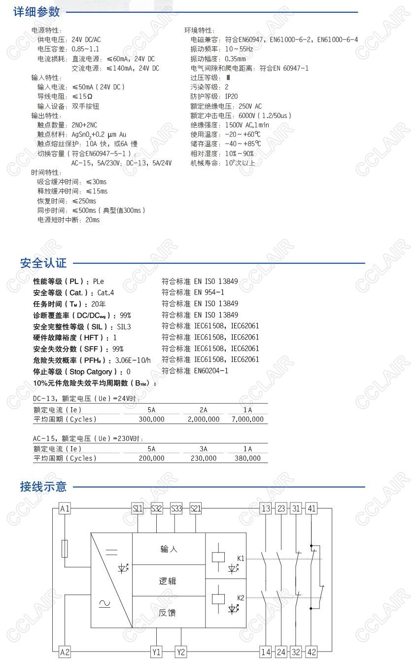 CZSR8001-2A2B是適用于急停按鈕、安全門控開關(guān)輸入,具有2路NO(常開)安全輸出觸點(diǎn)和2路NC(常閉)輔助輸出觸點(diǎn)的安全繼電器。它可選擇單雙通道操作,手動或自動復(fù)位,并具有通道間短路監(jiān)控功能。
