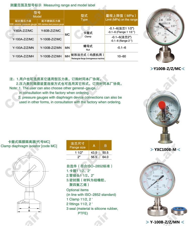Y-60A-Z/ZMC,Y-100A-Z/ZMC,Y-100A-Z/ZMN,Y-100A-Z/ZMH,衛(wèi)生型隔膜壓力表