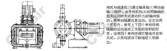 3、由于隔膜將被輸送介質(zhì)和傳動(dòng)機(jī)械件分開,所以介質(zhì)絕對不會(huì)向外泄漏。且泵本身無軸封,使用壽命大大延長。根據(jù)不同介質(zhì),隔膜分為氯丁橡膠、氟橡膠、丁晴橡膠等,可以滿足不同用戶的要求。