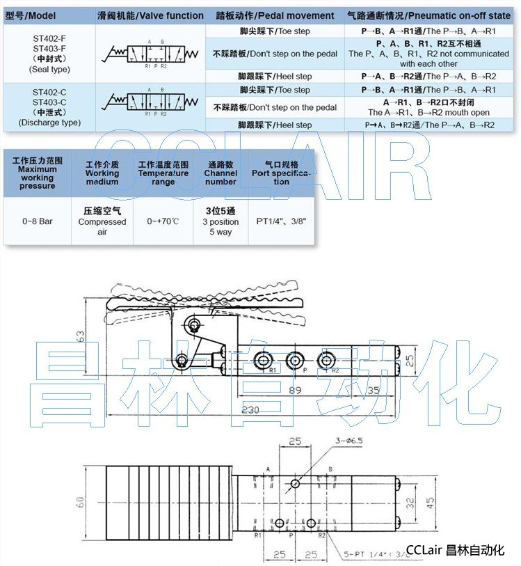 ST402-F,ST403-F,ST402-C,ST403-C,3位5通腳踏閥