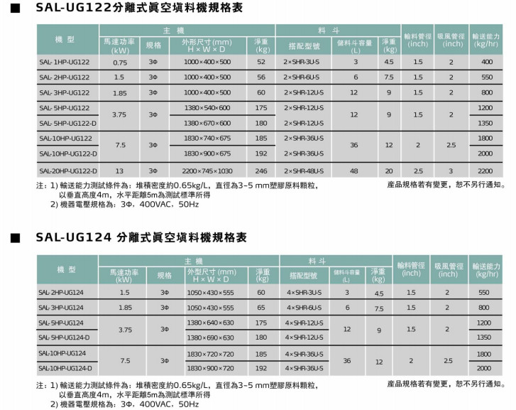 SAL-1HP-UG122,SAL-2HP-UG122,SAL-3HP-UG122,SAL-5HP-UG122,SAL-5HP-UG122-D,SAL-10HP-UG122,SAL-10HP-UG122-D,SAL-20HP-UG122-D,SAL-2HP-UG124,SAL-3HP-UG124,SAL-5HP-UG124,SAL-5HP-UG124-D,SAL-10HP-UG124,SAL-10HP-UG124-D,"一對二/四"分離式真空填料機