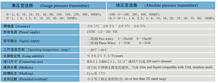 YD322-IE壓力變送器是由帶隔離膜充油壓力傳感器和儀表專用集成放大電路組成,使其具有精度高、穩(wěn)定性好、壽命長(zhǎng)、可靠性高、安裝方便等特點(diǎn)。適用于各種液體、氣體的壓力測(cè)量。 技術(shù)參數(shù)