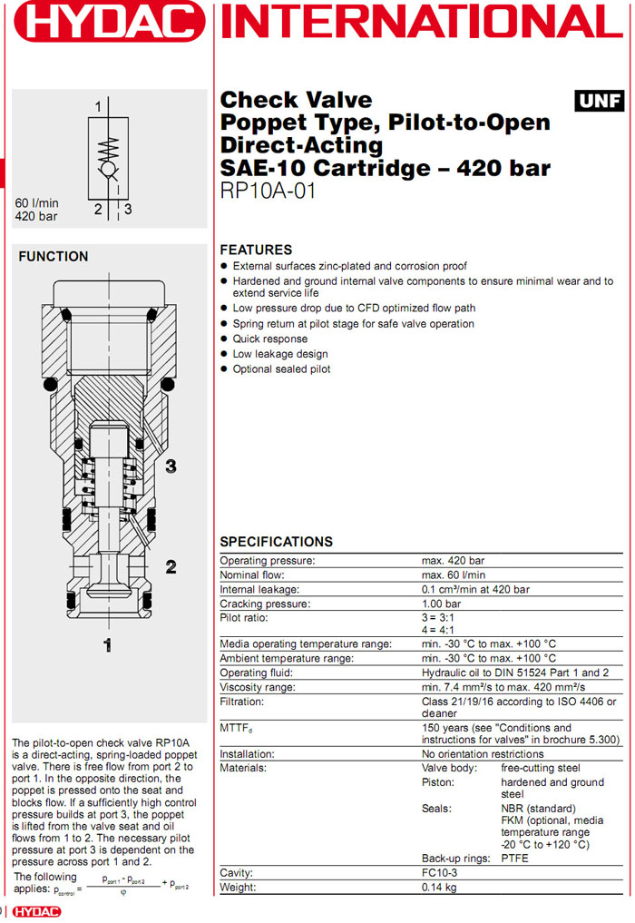 RP10A-01-C-N-15-3,RP10A-01-C-N-15-4,RP10A-01-C-NS-15-3,RP10A-01-C-NS-15-4,HYDAC止回閥