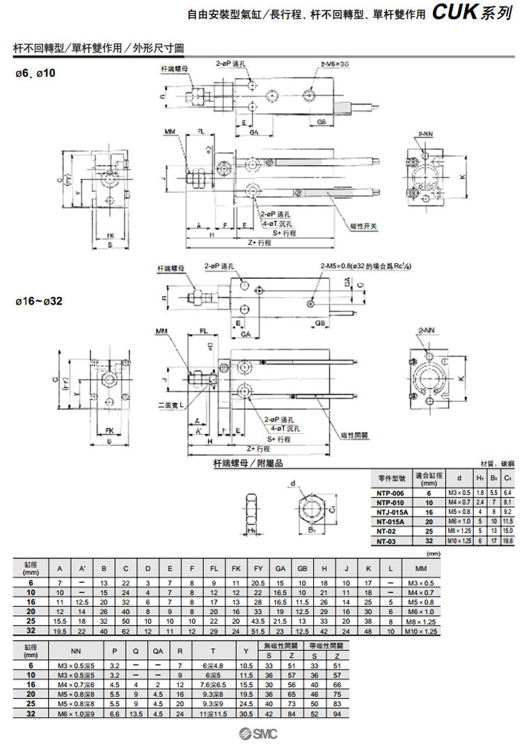 CUK6,CUK10,CUK16,CUK20,CUK25,CUK32,CDUK6,CDUK10,CDUK16,CDUK20,CDUK25,CDUK32,CUK6-40D,SMC自由安裝型氣缸
