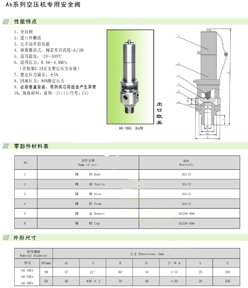 AK-16Cr-DN20,AK-25Cr-DN20,AK-40Cr-DN20,AK-16Cr-DN25,專用安全閥