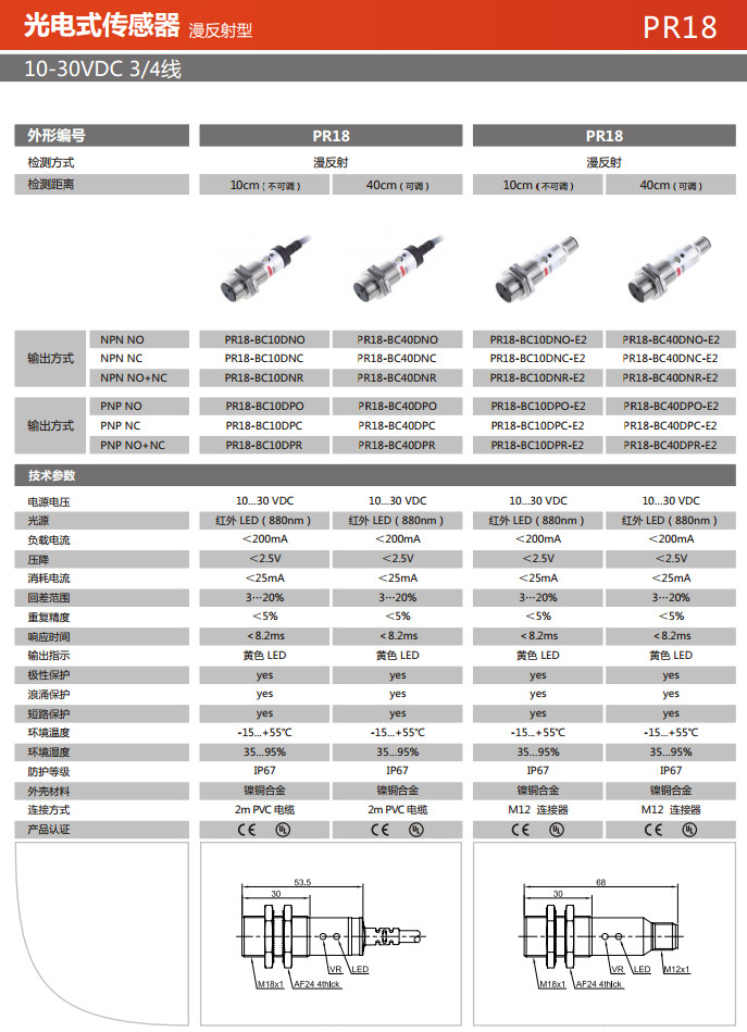 PR18-BC10DNO,PR18-BC10DNC,PR18-BC10DNR,PR18-BC40DNO,PR18-BC40DNC,PR18-BC40DNR,光電式傳感器 |