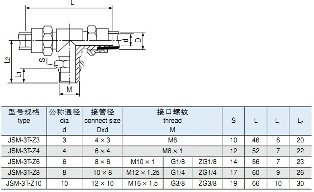 JSM-3T-Z3,JSM-3T-Z4,JSM-3T-Z6,JSM-3T-Z8,JSM-3T-Z10,鎖母式三通終端管接頭