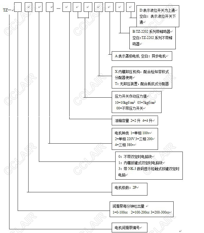 TZ-2232-410X 表示為單相220v配有NK-3型數(shù)顯微電腦、10kgf/cm2壓力開關(guān)、內(nèi)藏卸壓機構(gòu),4升油箱的TZ型潤滑泵。