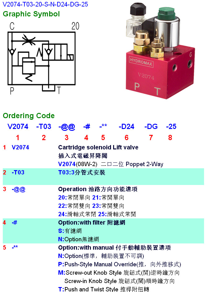 V2074-T03-21,V2074-T03-22,V2074-T03-23,V2074-T03-24,V2074-T03-20-S-N-D24-DG-25,HYDROMAX插入式電磁升降閥