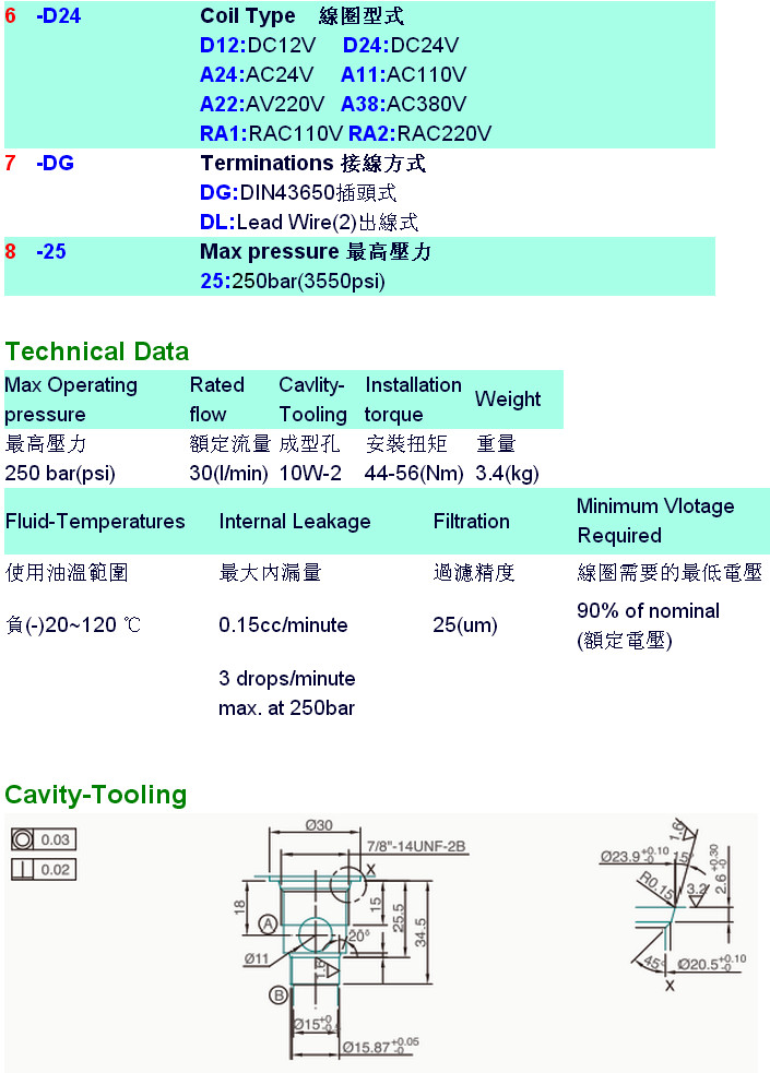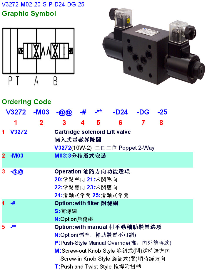 V3272-M03-21,V3272-M03-22,V3272-M03-23,V3272-M03-24,V3272-M03-20-S-N-D24-DG-25,HYDROMAX插入式電磁升降閥 |