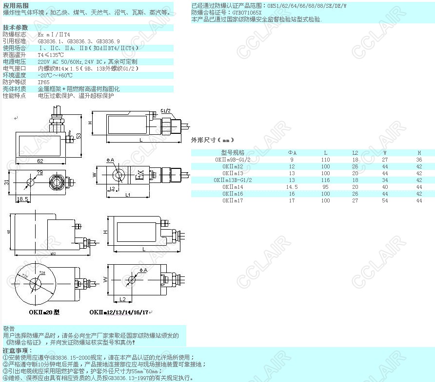 OKⅡm9B-G1/2,OKⅡm12,OKⅡm13,OKⅡm13B-G1/2,OKⅡm14,OKⅡm16,OKⅡm17,防爆電磁線圈 |