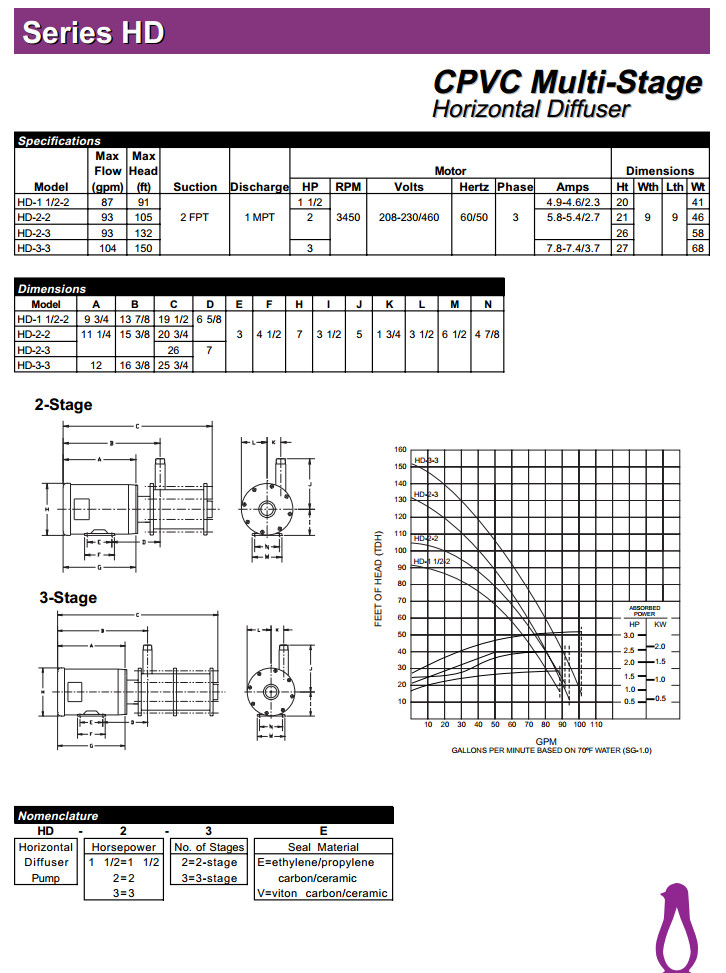 HD-1 1/2-2,HD-2-2,HD-2-3,HD-3-3,PENGUIN多級臥式泵