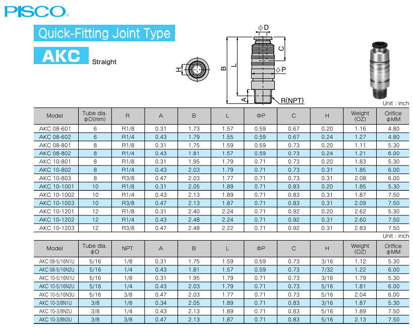 AKC08-601,AKC10-801,AKC10-1001,AKC08-5/16N1U,AKC10-5/16N1U,AKC10-3/8N1U,AKC08-802,PISCO耐熱管接頭