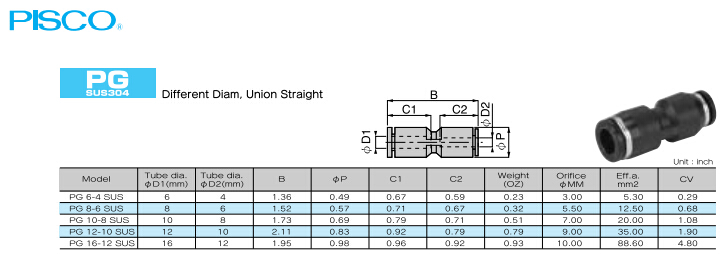 PG6-4SUS,PG8-6SUS,PG10-8SUS,PG12-10SUS,PG16-12SUS,PISCO快速接頭 |