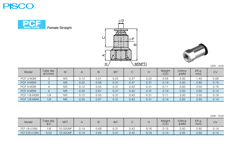 PCF3-M3M,PCF3-M5M,PCF4-M3M,PCF4-M5M,PCF1/8-M3M,PCF1/8-M5M,PCF1/8-U10MU,PCF5/32-U10MU