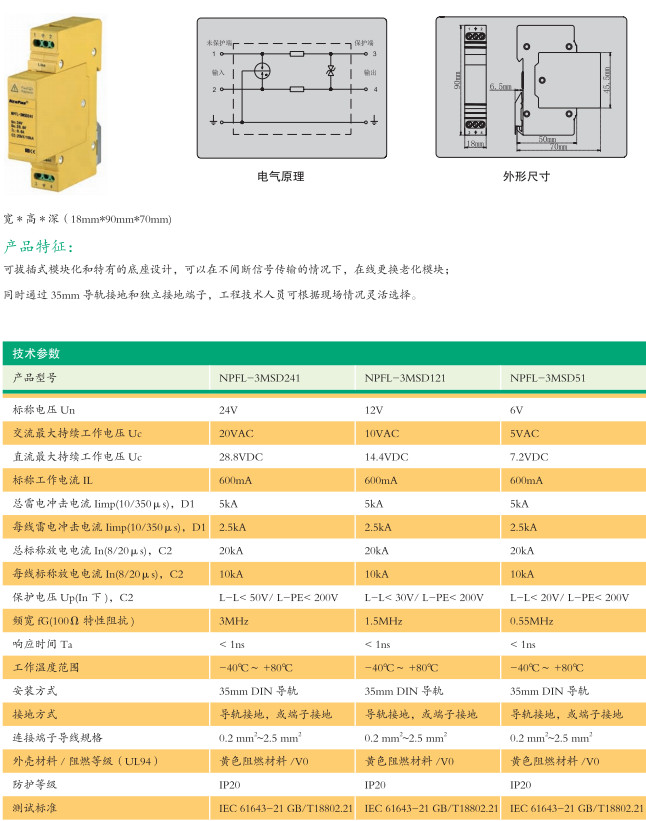 NPFL-3MSD51,NPFL-3MSD121,NPFL-3MSD241,二線制通用型信號浪涌保護(hù)器(浮地)