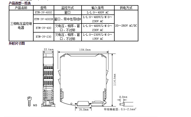ETM-3V-230、ETM-3V-400、ETM-3V-400、ETM-3V-400三相電壓監(jiān)控,依據(jù)用戶設(shè)定值實(shí)現(xiàn)對(duì)三相電的欠壓、過(guò)壓、不平衡度以及相序故障監(jiān)控。該模塊具有雙刀雙擲繼電器輸出。產(chǎn)品采用20~260V a.c./d.c.供電。電源、輸入和輸出三隔離。