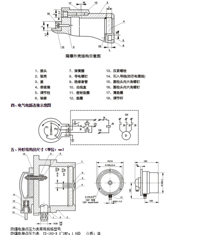 防爆電接點(diǎn)壓力表系按GB3836.183《爆炸性環(huán)境用防爆電氣設(shè)備通用要求》和GB3836.28爆炸性環(huán)境用防爆電氣設(shè)備 隔爆型電氣設(shè)備“d”》的有關(guān)規(guī)定相關(guān)標(biāo)準(zhǔn)進(jìn)行設(shè)計(jì),并經(jīng)由國家指定的檢驗(yàn)機(jī)構(gòu)所審批的圖樣和技術(shù)文件進(jìn)行制造。