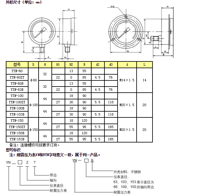 YTN、YTN-B/YJTFN系列不銹鋼耐震壓力表常壓型號