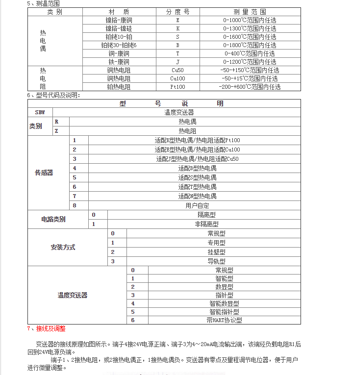1、輸入信號:熱電偶:K、E、J、B、S、T、N。熱電阻:Pt100、Cu50、Cu100(三線制、四線制)。智能型溫度變送器的輸入信號可通過手持器和PC機任意設置;
